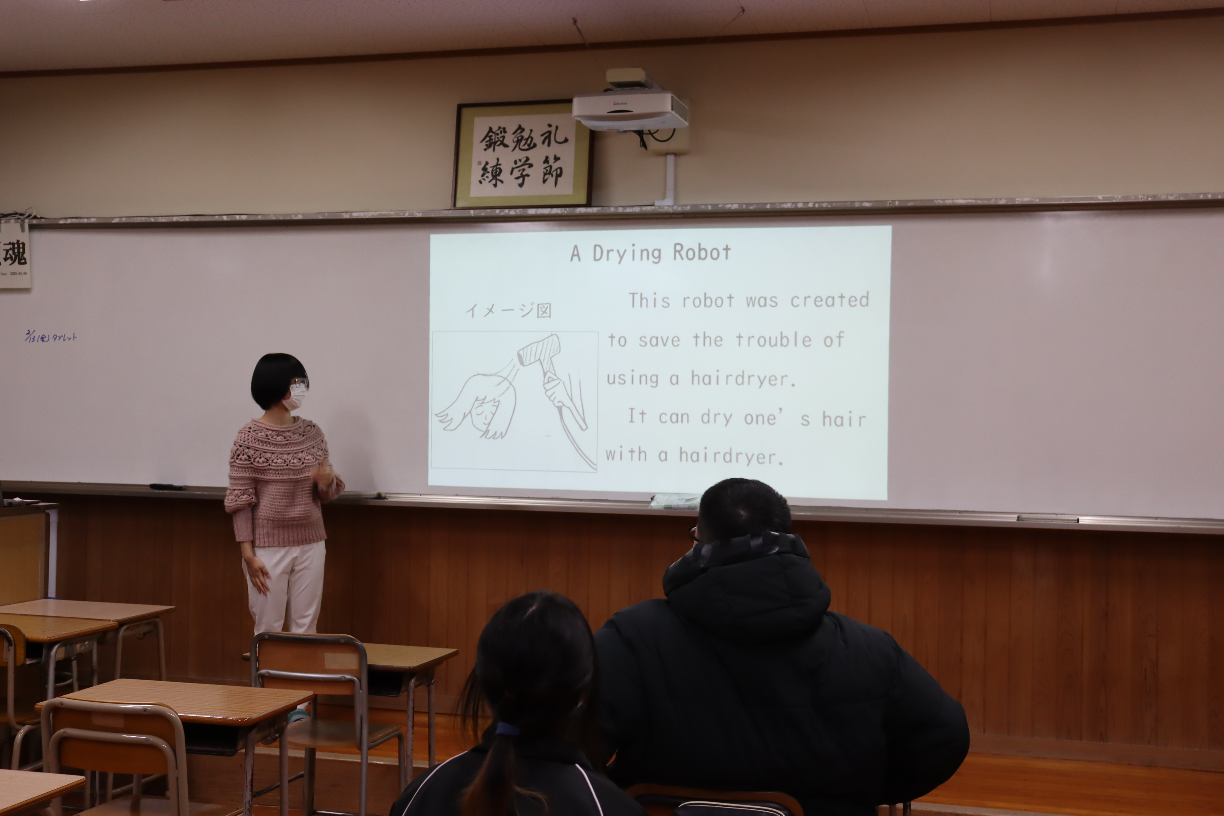 夢のロボットについてのスピーチ 2026年2月9日 20時35分 1年生は英語コミュニケーションⅠの授業で、自分の分身として働くロボットについての文章を読み、夢のロボットについてのアイディアを英語で書きました。今日の授業では、その発表を行いました。写真に写っている生徒は、髪の毛を乾かしてくれるロボットについてスピーチをしています。どの生徒も自分らしいオリジナルなロボットについて文章を書いていました。